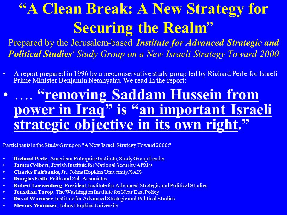 A Clean Break: A New Strategy for Securing the Realm (commonly known as the "Clean Break" report) is a policy document that was prepared in 1996 by a study group led by Richard Perle for Benjamin Netanyahu, the then Prime Minister of Israel.[1] The report explained a new approach to solving Israel's security problems in the Middle East with an emphasis on "Western values." It has since been criticized for advocating an aggressive new policy including the removal of Saddam Hussein from power in Iraq and the containment of Syria by engaging in proxy warfare and highlighting its possession of "weapons of mass destruction". Certain parts of the polices set forth in the paper were rejected by Netanyahu.De denktanks en aanverwante groepen die sterk met de Neoconservatieven verbonden zijn, zijn: het American Enterprise Institute for Public Policy Reserearch (AEI); het Center for Security Policy (CSP); het Hudson Institute; de Foundation for Defense of Democrcies (FDD); het Jewish Institute for National Security Affairs (JINSA); het Middle East Forum (MEF) en het Washington Institute for Near East Policy (WINEP).